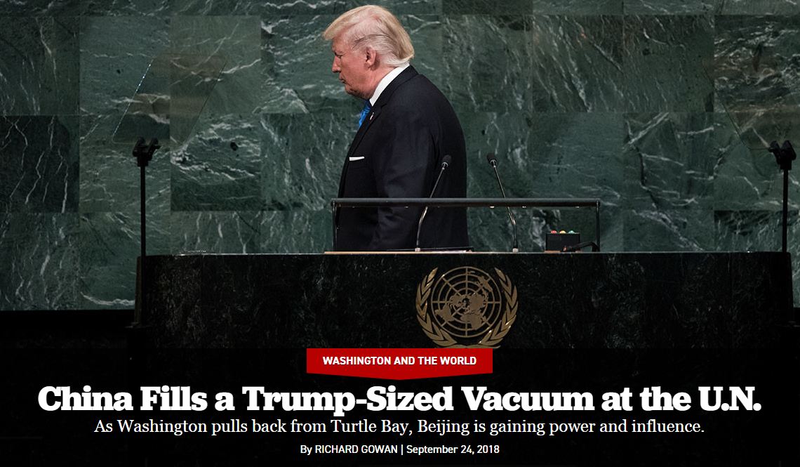 當西方官員在抱怨中國擴大影響力的時候,更諷刺的是,特朗普卻實際上在加速中國在聯合國的成果,因為他試圖削弱多邊主義。