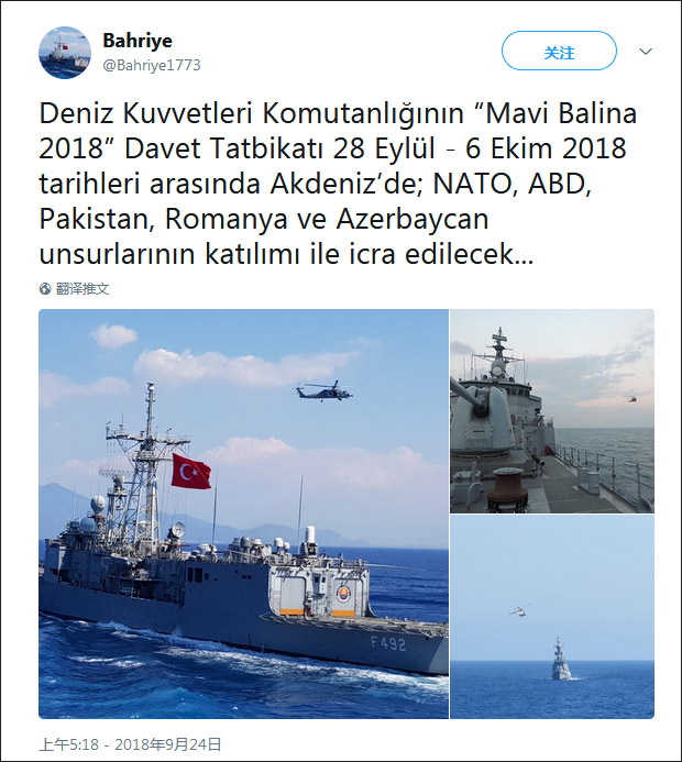 聲明稱:由土耳其主辦的“Mavi Balina-2018”軍事演習將於9月28日至10月7日在地中海東部舉行。土耳其海、空軍、北約、美國、阿塞拜疆、巴林、阿爾及利亞、卡塔爾、科威特、巴基斯坦、羅馬尼亞和沙特阿拉伯將參加演習,演習主要目標是反潛訓練。共有4艘巡防艦、5艘潛水艇、2艘驅潛快艇、1艘物資技術保障船隻、3架飛機和6架直升機將參加演習。