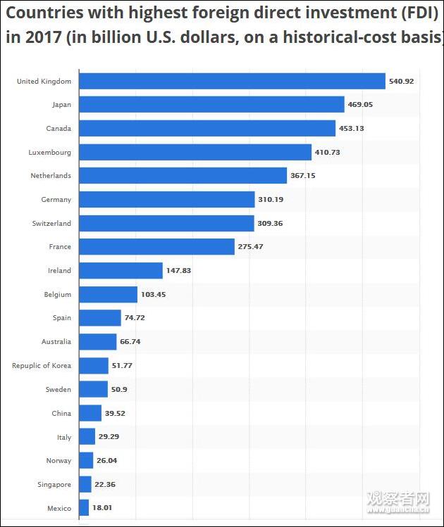 美國數據網站Statista的數據,2017年中國對美FDI總額排名第15名
