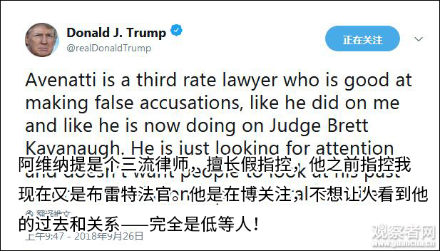對此,特朗普在聯合國開會時發了一條推特,譴責阿維納提,但未提及斯威特尼克控訴的事實本身。