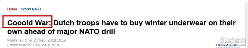 據“今日俄羅斯”(RT新聞)當地時間9月27日報道,還有一個月,在挪威舉行的北約演習就要開始了,但是荷蘭國防部卻沒有替士兵們準備好冬裝,需要他們自己去買保暖內衣。