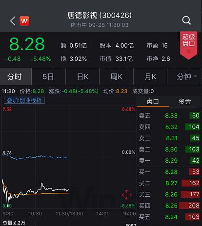 截至9月28日午間收盤,唐德影視股價跌幅達到5.48%,以此計算,公司總市值半日蒸發1.92億。