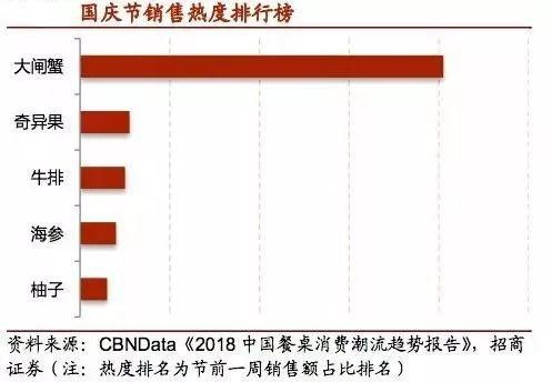 根據CBNData《2018中國餐桌消費潮流趨勢報告》,在國慶節銷售熱度排行榜中,大閘蟹穩居第一。