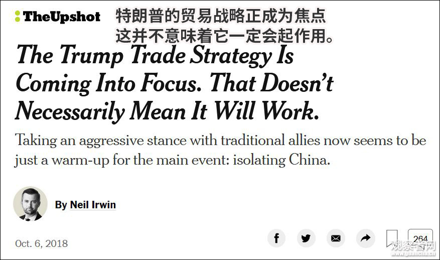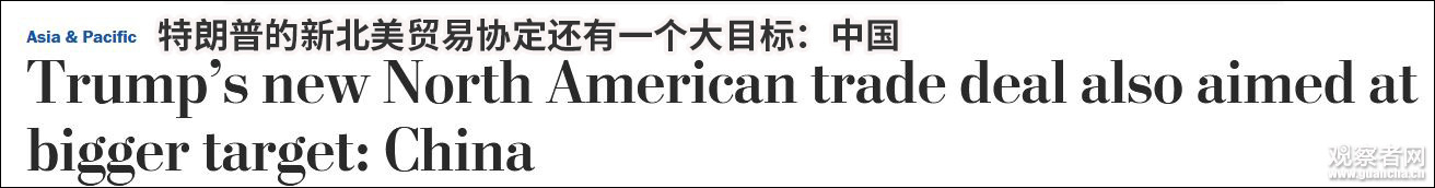 9月30日,特朗普政府的一名高級官員就曾表示,這份新協議可以讓白宮更加集中注意力在中國身上。他還表示,這將是未來貿易協議的“劇本”(playbook),暗示華盛頓可能向其他盟國施壓,要求它們疏遠與北京的貿易關係。