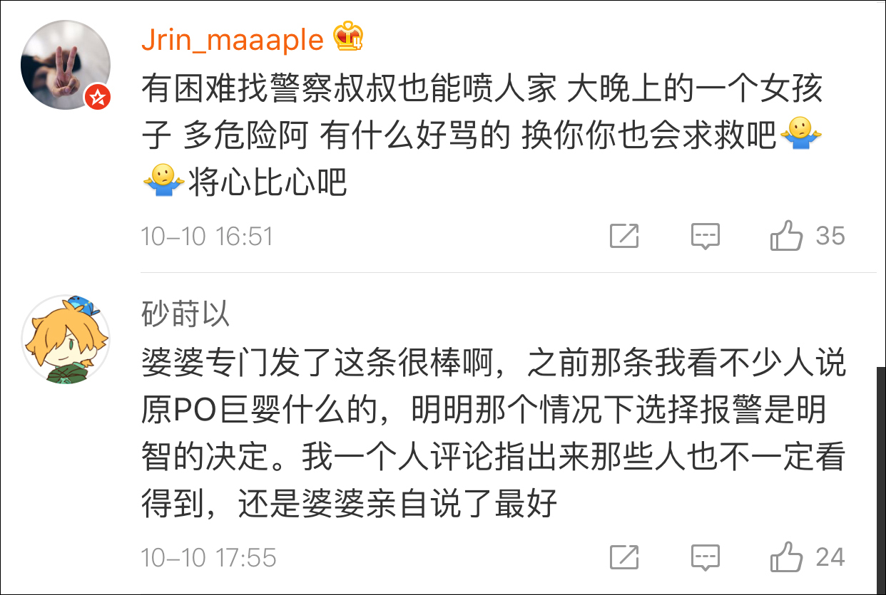 她在微博中還表示:真的很感動,我一個人丟了出了4個警,我真的覺得這才是人民公僕的好榜樣。