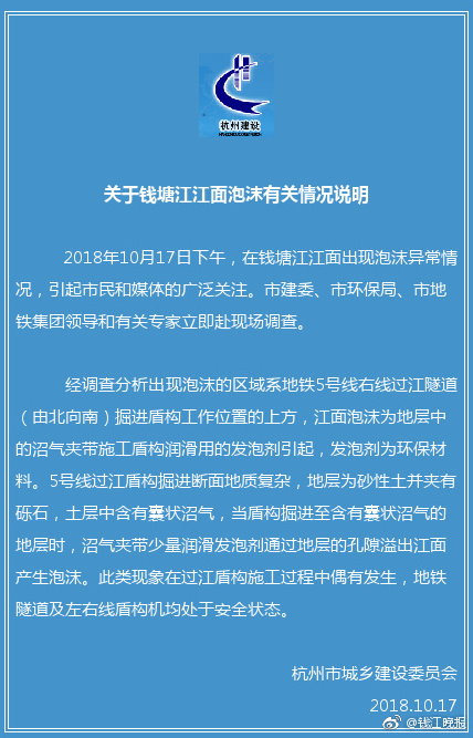 2018年10月17日下午在錢塘江江面出現泡沫異常情況,引起市民和媒體的廣泛關注。市建委、市環保局、市地鐵集團領導和有關專家立即赴現場調查。