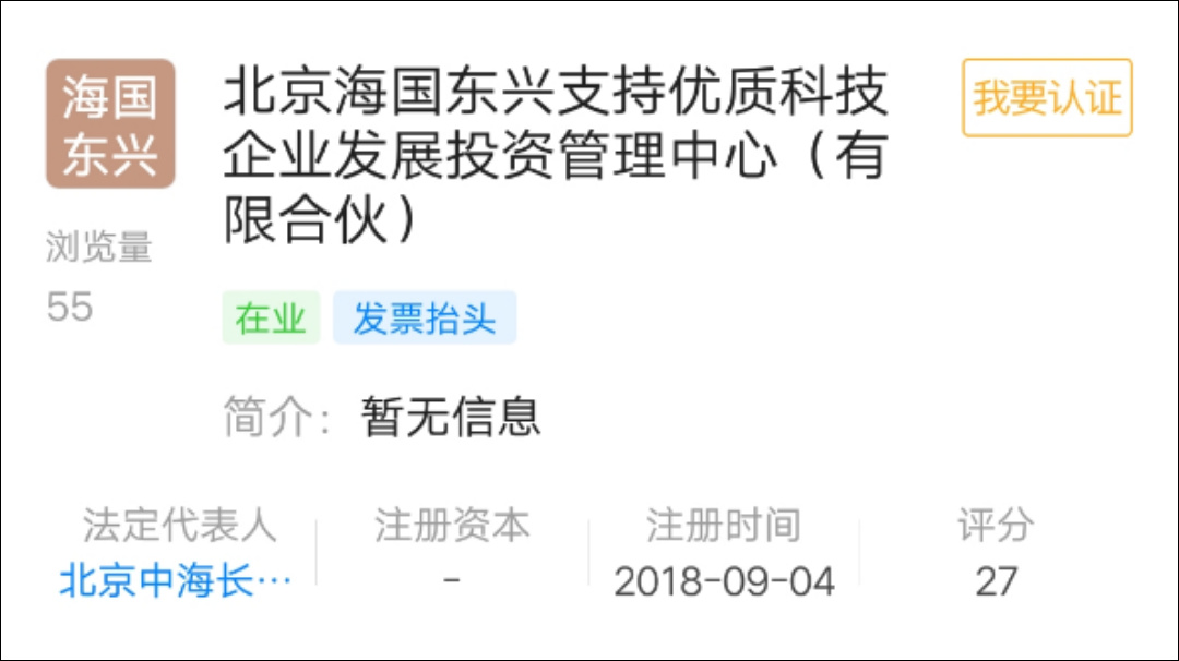 觀察者網查詢天眼查發現,北京海國東興支持優質科技企業發展投資管理中心(有限合夥)註冊於2018年9月4日。