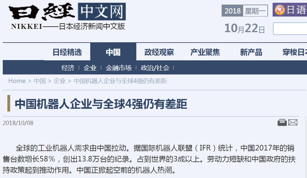 文章稱,據國際機器人聯盟(IFR)統計,中國2017年的銷售台數增長58%,創出13.8萬台的紀錄,佔到世界的3成以上。“勞動力短缺和中國政府的扶持政策起到推動作用,中國正掀起空前的機器人熱潮。”