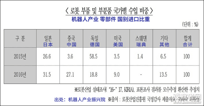 報道提到了韓國機器人產業振興院(Korea Institute for Robot Industry Advancement,下稱:KIRIA)的數據:2016年,韓國進口自中國的機器人零部件佔比,從前一年的3.6%暴漲近8倍,份額達到27.1%,成為僅次於日本的第二大進口國。