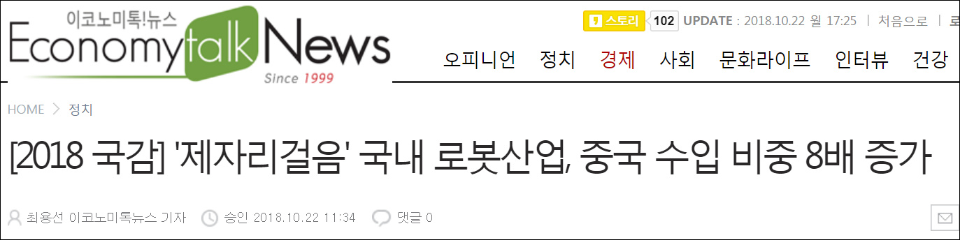 文章標題:【2018年國政監查】“原地踏步”的韓國機器人產業,中國進口比重增加8倍