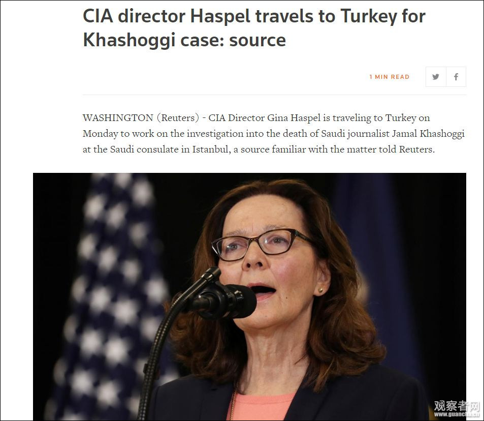 距離他承諾公佈“赤裸裸的真相”的時間越來越近,一直卷在此次“風暴”中央的美國派出情報高官前往土耳其。路透社援引一名知情人士消息,美國中央情報局(CIA)局長吉娜·哈斯佩爾於週一(22日)前往土耳其,參與卡舒吉事件的調查。