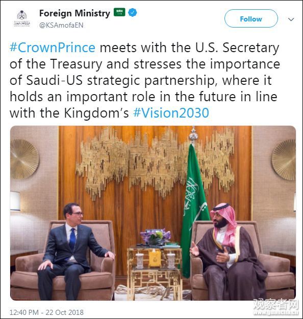 據《華盛頓郵報》當地時間22日報道,據沙特政府消息,姆努欽於22日會見了薩勒曼王儲。沙特外交部在推特上發佈了此次會晤的照片,並寫道:王儲會見美國財長,強調沙特-美國戰略伙伴關係的重要性,沙特-美國戰略伙伴關係在未來扮演着重要角色,與沙特的“願景2030”保持一致。