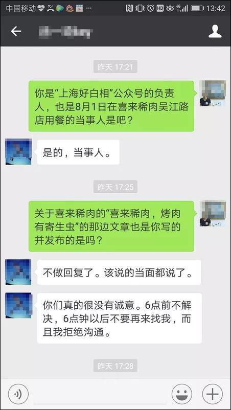 除了房企,餐飲企業也容易被勒索,因為食品安全問題很容易吸引眼球。例如,上海有很多吃喝玩樂的號,個別自媒體號也喜歡通過寫負面新聞來收“封口費”,因為這樣比正面推廣來錢快多了。但這一套路在2017年大白於天下——去年8月1日,“上海好白相”微信公眾號發文,有網友稱其和朋友在上海吳江路的“喜來稀肉”聚餐,在烤肉裏吃出了疑似寄生蟲的東西。