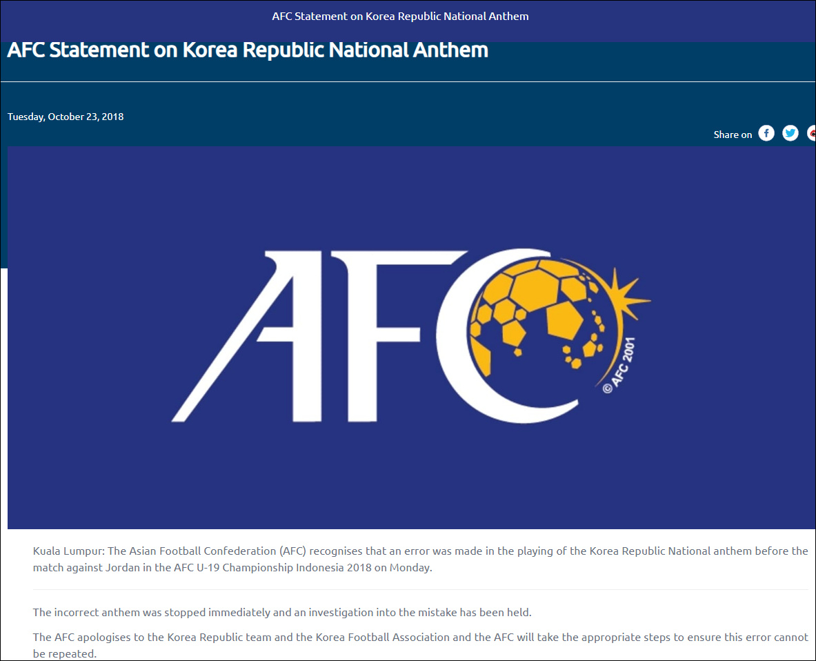 據韓聯社23日報道,當天,韓國足協正式向亞足聯投訴。當天,亞足聯在官網發佈聲明,承認在22日舉行的2018年亞足聯U19錦標賽韓國對陣約旦的比賽前,韓國國歌的演奏出現了錯誤。亞足聯稱,這一錯誤立即被糾正了,並且進行了相關調查。亞足聯向韓國隊和韓國足球協會道歉,將會採取適當措施確保此錯誤不再重演。