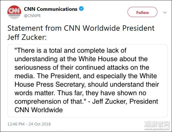 CNN總裁傑夫·朱克也在當天喊話特朗普、白宮發言人桑德斯,説白宮一直不知道,他們對媒體的攻擊會有多嚴重的後果。