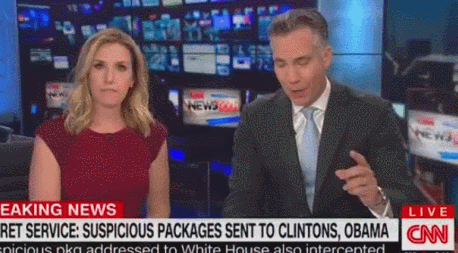 當地時間10月24日,美國有線電視新聞網(CNN)的演播室裏,兩名主播正在直播:美國前總統奧巴馬辦公室和前國務卿希拉里都收到了郵寄的爆炸裝置。