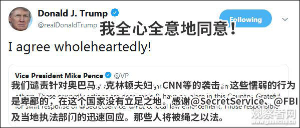 24日,美國副總統彭斯發推特稱會將該負責的人繩之以法。特朗普轉發表示“全心全意同意!”