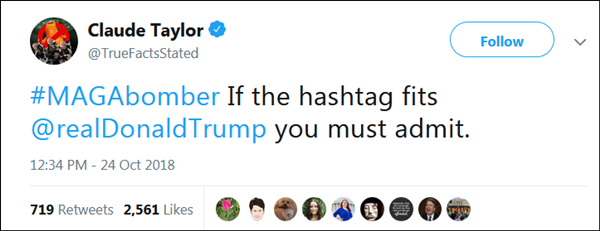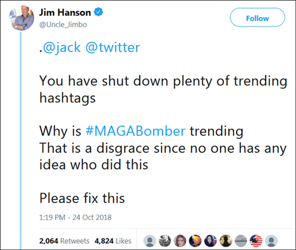 有人呼籲推特撤下標籤:“你們已經關閉了很多流行話題標籤,為什麼留着MAGA Bomber?這是恥辱,因為沒有人知道是誰幹的。請解決這個問題。”