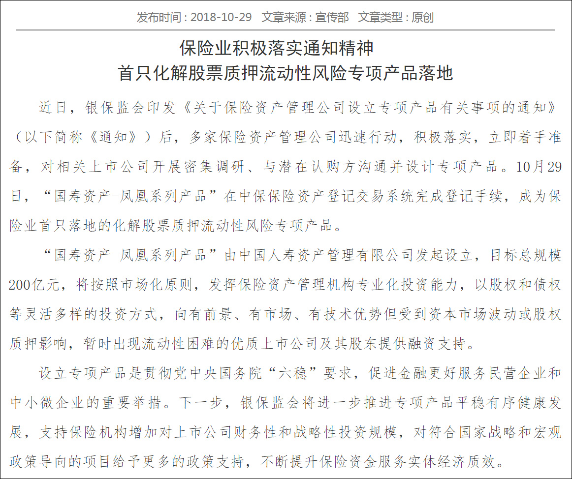 29日晚,銀保監會網站發佈消息,當天,“國壽資產-鳳凰系列產品”在中保保險資產登記交易系統完成登記手續,成為保險業首隻落地的化解股票質押流動性風險專項產品。
