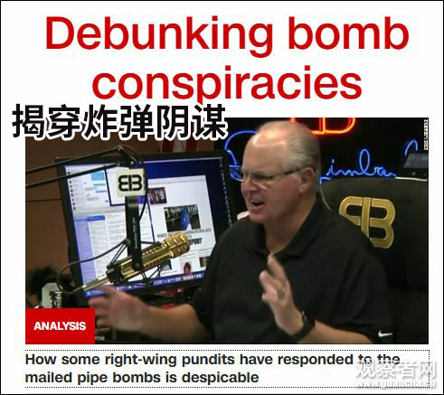 保守派電台談話節目主持人拉什·林博(Rush Limbaugh)23日表示,“共和黨或是保守派這樣做,沒有任何道理。”他在節目中稱,民主黨擔心他們在中期選舉中會失勢,因此暗示觀眾,這事可能是“一個民主黨人或民主黨人教唆的瘋子”做的。