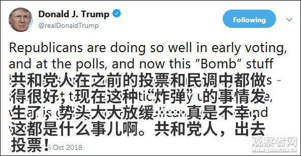 中期選舉將近,如果共和黨失利,特朗普可能也已經想好如何“甩鍋”了:都怪那些炸彈包裹,壓住了共和黨強勁的勢頭。