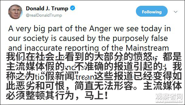 在炸彈包裹事件發生,主流媒體都在指責特朗普平時煽動“仇恨言論”的時候,特朗普繼續將矛頭調轉,反懟回去。他25日發推特,指責媒體: