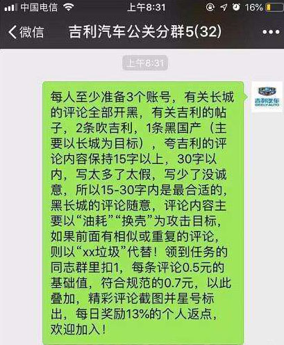 這張截圖是由一署名為“吉利公關部經理”的賬號,在某新聞APP平台上發佈的。根據截圖內容,在這個名為“吉利汽車公關分羣5”的羣裏,有人發佈消息稱,“每人至少準備3個賬號,有關長城的評論全部開黑,有關吉利的帖子,2條吹吉利,1條黑國產(主要以長城為目標)……”“……每條評論0.5元的基礎值,符合規範的0.7元,以此疊加,精彩評論截圖並星號標出,每日獎勵13%的個人返點,歡迎加入!”