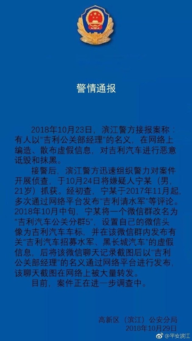 10月29日上午,杭州市公安局濱江分局就此事發布通報稱,2018年10月23日,濱江警方接報案稱有人以“吉利公關部經理"的名義,在網絡上編造、散佈虛假信息,對吉利汽車進行惡意詆譭和抹黑。接警後,濱江警方組織警力對案件開展偵查,於10月24日將嫌疑人寧某(男,21歲)抓獲。