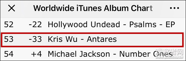 觀察者網查詢了iTunes的相關榜單,發現吳亦凡的“屠榜”僅限於美國區榜單。