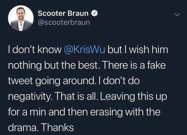 11月5日,Scooter Braun正式發文闢謠,澄清所謂“指責吳亦凡刷榜”一事。