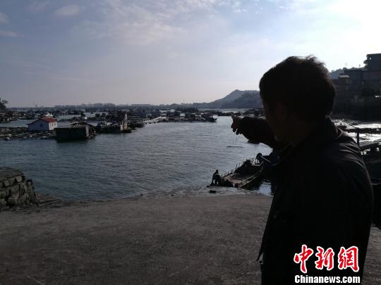58歲的肖車明站在碼頭上,手指向不遠處的自家漁排,對今後的日子充滿無奈。 陳龍山 攝