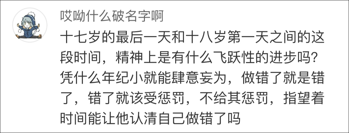 對於警方和媒體“火速”公開其個人資料,不少網友覺得幹得漂亮,但不禁讓人想到另一個問題:十七歲的最後一天,和十八歲的第一天,一個人的心智會有什麼質的變化嗎,懲罰罪行才是重要的吧。