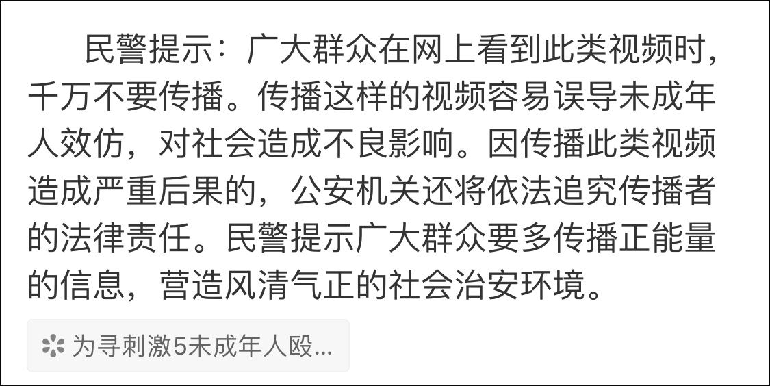 同時,此類視頻容易誤導未成年人效仿,警方提示網友不要傳播,因傳播此類視頻造成嚴重後果的,還將被追究法律責任。
