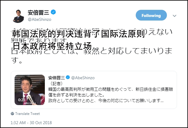 安倍當天在推特上回應,將堅持既有立場,認為賠償問題已“最終且完全解決”