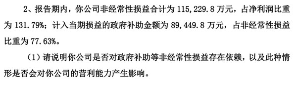 針對比亞迪2018年上半年的財報數據,深交所對比亞迪發出問詢函,“上半年,你公司非經常性損益合計為115,229.8萬元,佔淨利潤比重為131.79%;計入當期損益的政府補助金額為89,449.8萬元,佔非經常性損益比重為77.63%。請説明你公司是否對政府補助等非經常性損益存在依賴,以及此種情形是否會對你公司的營利能力產生影響。”