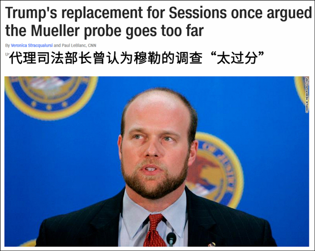 特朗普任命的代理司法部長,曾批穆勒通俄門調查“太過分”