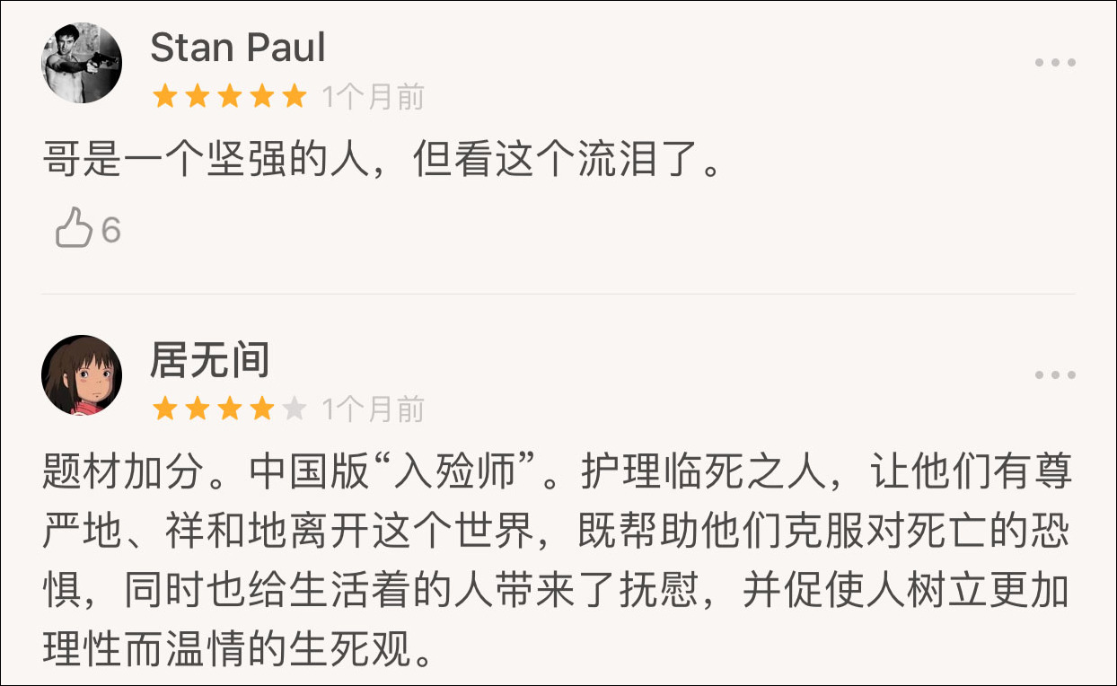有網友在看完後表示,難得一見的關注了國人面臨死亡時的態度,希望能夠持續關注這個羣體。