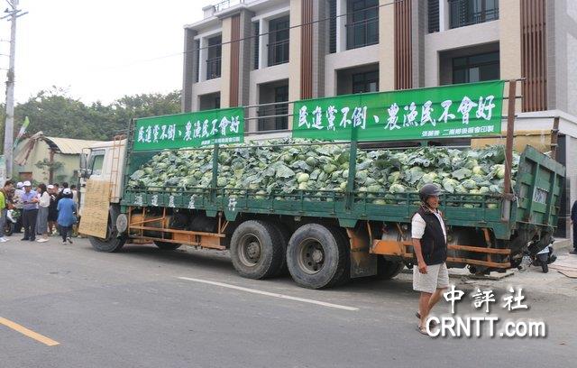一羣挺張麗善的西螺、二崙農民,利用這場全台矚目的時刻,一早就運了3萬公斤的高麗菜與1.8萬公斤的蘿蔔到造勢場外堆放,抗議菜價慘跌,民進黨當局卻坐視不管。農民並高掛“民進黨不倒,農漁民不好”的布條,向執政黨表達農民的怒吼。