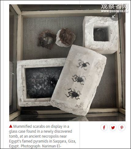 據悉,在一個長方形石棺中,有兩個聖甲蟲木乃伊,石棺的蓋子上還有聖甲蟲的圖案裝飾。還有一批聖甲蟲木乃伊在另一小石棺中被發現。