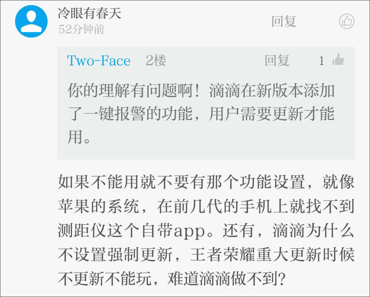 根據用户提供截圖,Little_JN使用的APP版本系今年8月的舊版,因系統迭代的緣故,舊版的“緊急求助”功能已經停用,且女乘客未設置緊急聯繫人。滴滴方面表示,希望用户定期更新軟件,以確保平台推出的相關安全功能在需要的時候可以發揮作用。
