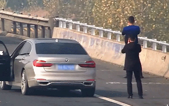 當日,青銀高速高唐境內因突發團霧,發生兩處多輛車碰撞起火的燃燒事故,就在救援人員緊急施救時,一輛寶馬私家車出現在了事故後方,看到車禍畫面後,司機將車停在了應急車道,下車若無其事地拿出手機拍攝了起來。另一名同行人員拍完後又一次走近了事故現場。