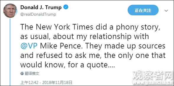 特朗普寫道:“和以往一樣,《紐約時報》又報了一則假新聞,關於我和副總統彭斯相處如何的假新聞。他們編造了消息來源,卻不來問問我這個唯一知道真相的人。”