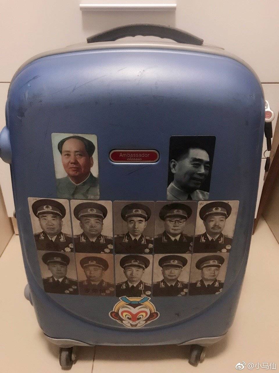 只見塗們的行李箱上貼着我國十大大將粟裕、譚政、陳賡、許光達、徐海東等開國將領,其中還夾雜着雷鋒的紅色貼紙。此外,箱子周圍還貼了一圈大隊長標誌、葫蘆娃、黑貓警長……