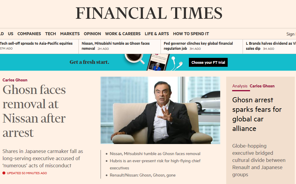 戈恩被捕震動業界。20日,英國《金融時報》頭條刊文介紹此事,將此事形容為“汽車行業最受待見的高管突然垮台”。