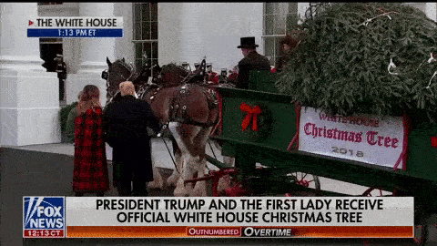 11月19日,一架裝載着聖誕樹的馬車抵達白宮。按往年慣例,總統特朗普攜夫人梅拉尼婭前往迎接,現場還有眾多記者。