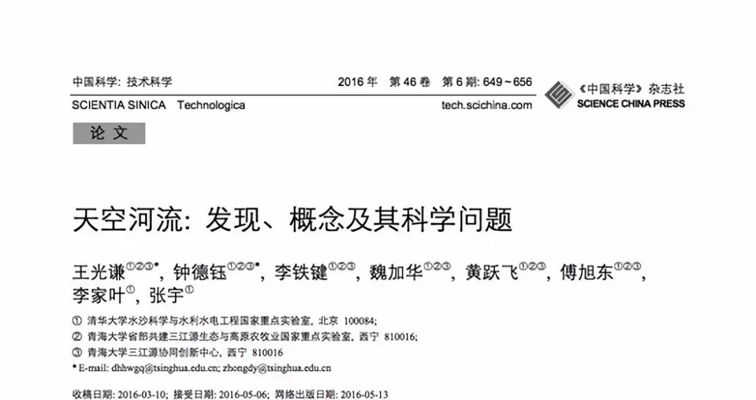2016年5月,青海大學校長、中科院院士王光謙帶領的團隊在《中國科學:技術科學》上發表題為《天空河流: 發現、概念及其科學問題》,正式提出“天空河流(River in the Sky)”及其簡稱“天河(Sky River)”的概念。