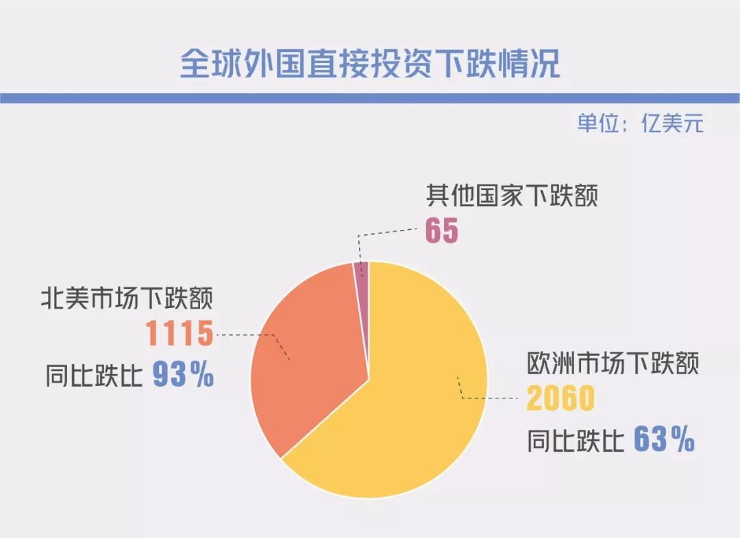 歐洲今年上半年接受的外國直接投資數額下跌了2060億美元,同期跌比93%;北美下跌了63%(1115億美元)。這兩個地區下降的外國直接投資淨值為3175億美元,這一數額十分接近全球總下降數額3240億美元。