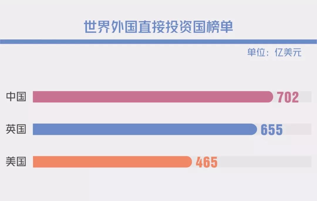 數十年來長期佔據世界外國直接投資國榜單榜首的美國,於今年丟失了榜首的寶座,以465億美元的成績滑至了第三位。第一位和第二位分別由中國(702億美元)和英國(655億美元)佔據。