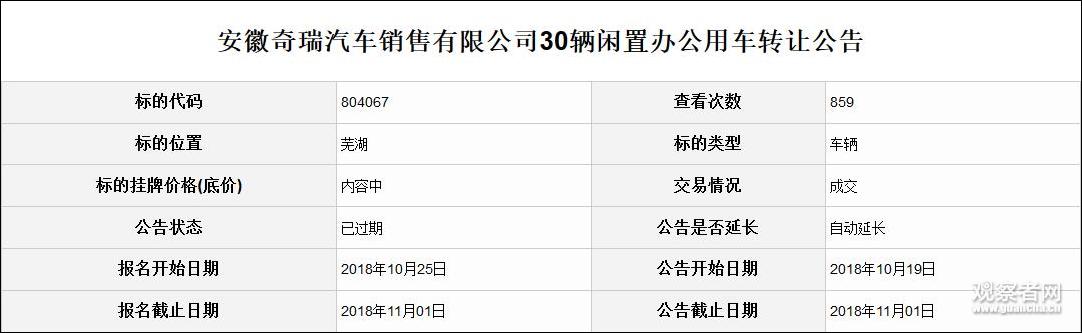 觀察者網還注意到,就在增資項目掛牌期間,奇瑞變賣名下數十輛閒置辦公用車,其中奇瑞股份53輛部分成交,安徽奇瑞汽車銷售有限公司30輛全部成交。