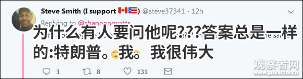 去年,他也是這麼做的,儘管沒有直白地説要感謝自己。2017年11月23日的推特上,特朗普寫道:“感恩節快樂,你們的國家開始越來越好。就業崗位迴流,有史以來最高的股票牛市,軍隊變得真正強大,我們將建起邊境牆,照顧好退伍老兵,有最棒的最高法院大法官,創紀錄地削減監管規則,17年來最低失業率……!”